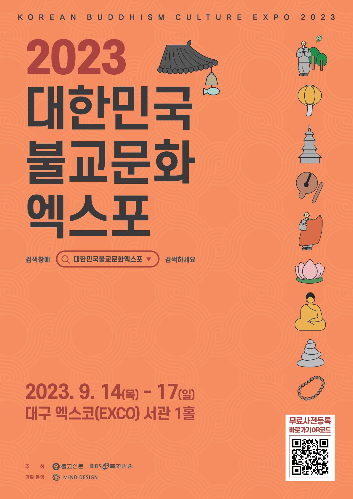 불교 문화콘텐츠 산업의 진흥을 꾀하는 ‘2023대한민국불교문화엑스포’가 9월 14일부터 17일까지 대구 엑스코(EXCO) 서관 1홀에서 ‘대구·경북의 불교문화 산업’을 주제로 개최된다. 대한민국불교문화엑스포는 공식 홈페이지를 통해서도 참여할 수 있다.