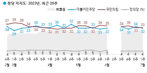 한국갤럽이 2023년 7월 첫째 주(4~6일) 정기 여론조사 결과를 발표했다.