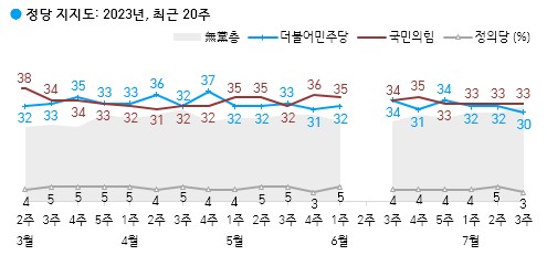 국민의힘 33%, 더불어민주당 30%, 정의당 3%, 무당층 32%...무당층 윤석열정부 이후 최고
