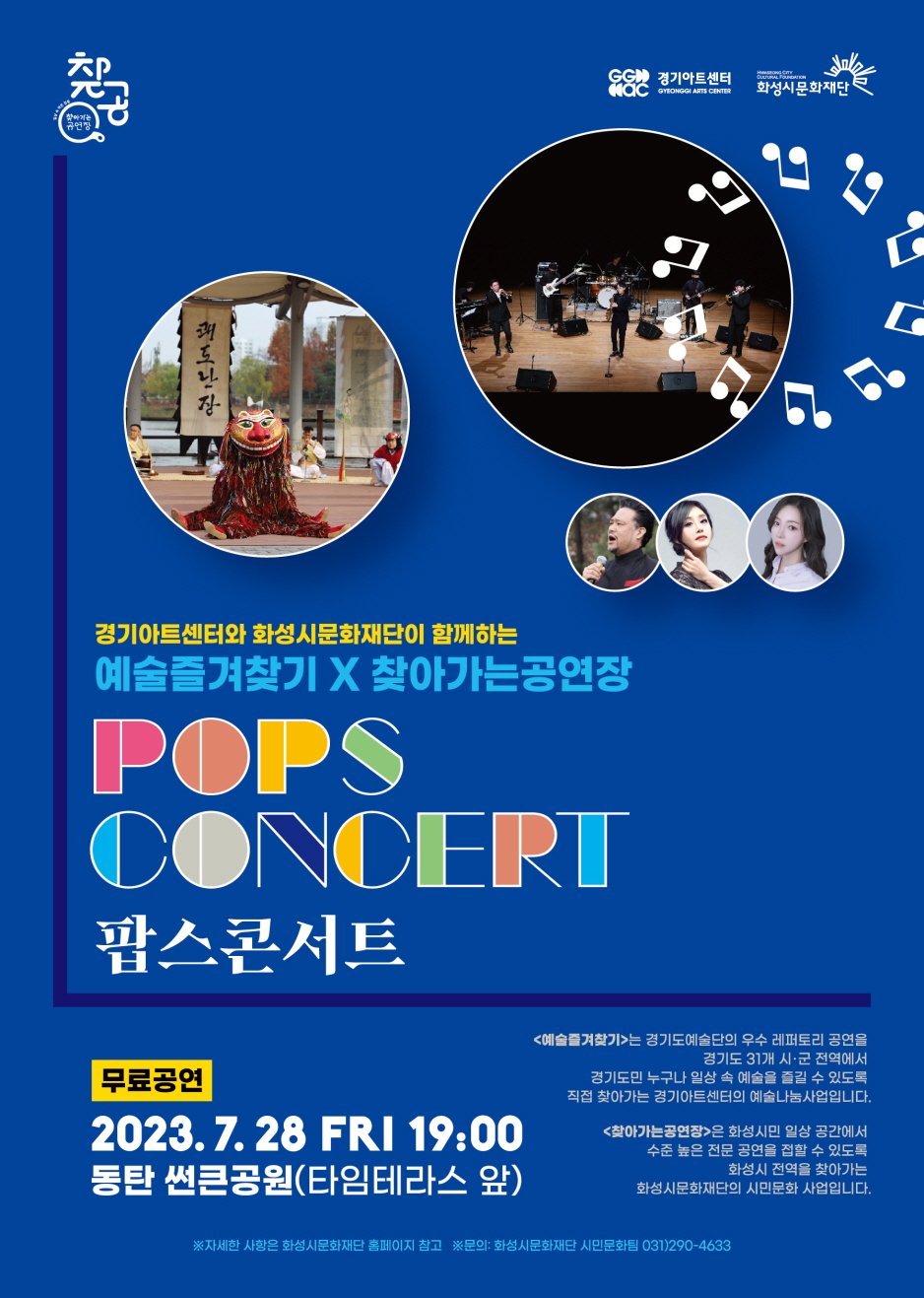 이번 공연은 동탄 썬큰공원(타임테라스 앞 분수) 행사장에서 7월 28일(금) 19시부터 시작하며 사전 예매 없이 전석 무료로 진행된다. 기타 자세한 사항은 화성시문화재단 누리집에서 확인할 수 있다.
