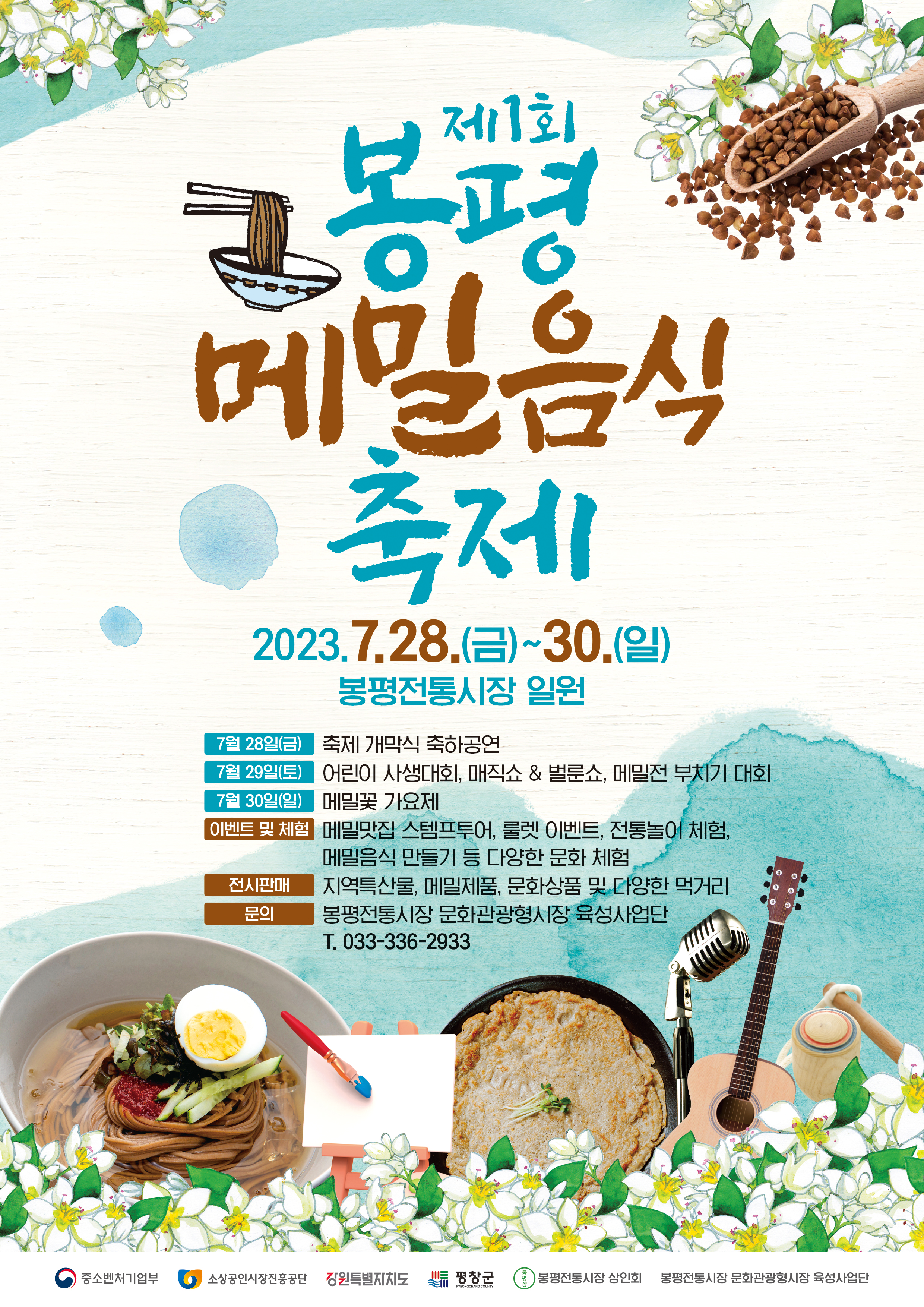 이효석의 메밀꽃 필 무렵의 고장인 봉평전통시장에서‘봉평메밀음식축제’를 개최한다. 축제는 7월 28일부터 7월 30일까지 오전 10시부터 오후 5시까지 메밀을 활용한 다양한 먹거리와 풍성한 체험 프로그램으로 운영된다.