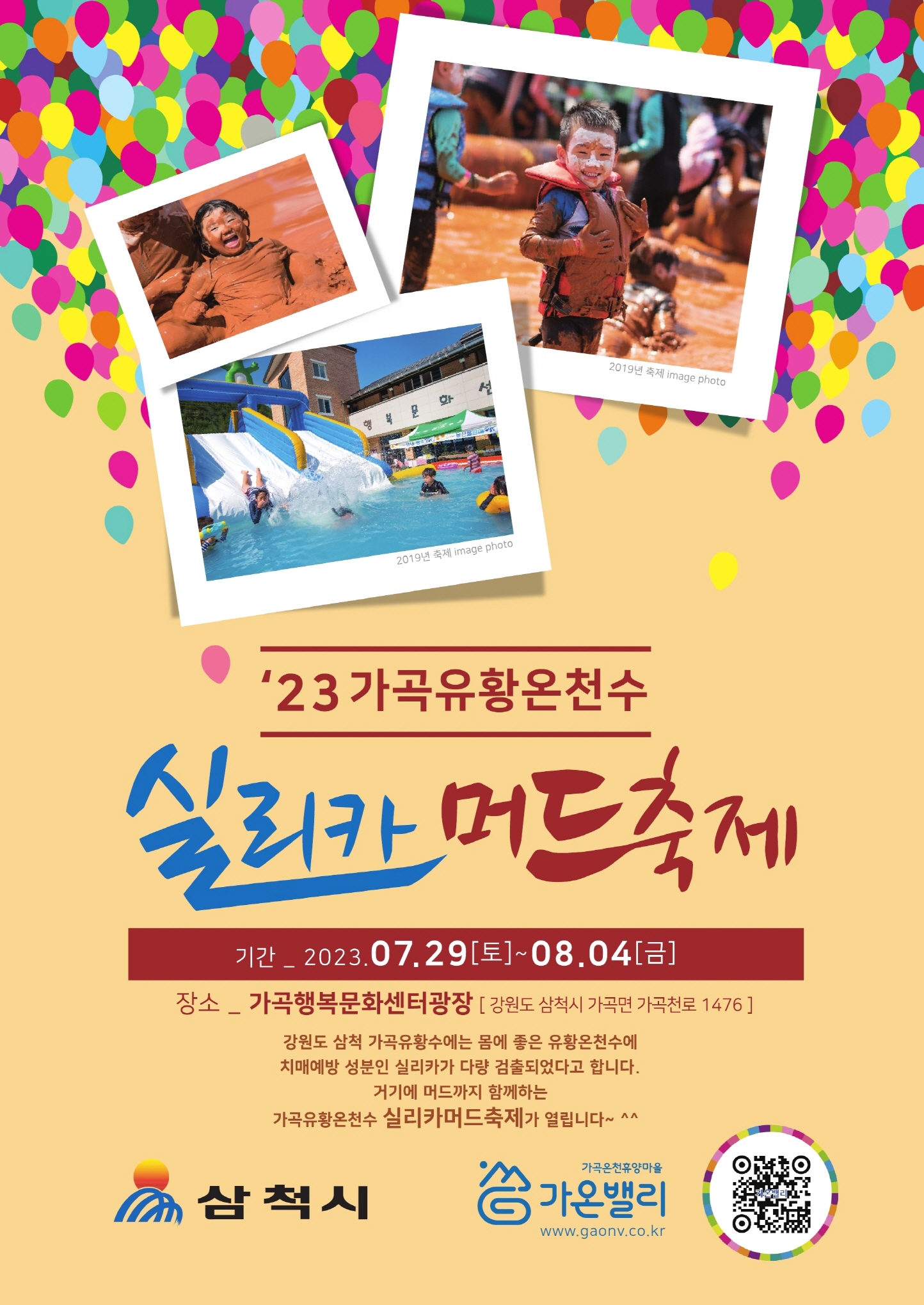 ‘2023년 가곡 유황온천수 실리카 머드축제’는 오는 7월 29일(토)부터 8월 4일(금)까지 7일 동안 운영되며, 축제 운영 기간 동안 오전 10시부터 오후 5시까지 가곡면 가온밸리 행복문화센터 광장에서 개최된다.