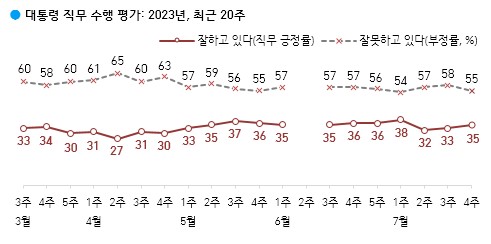 | 윤석열 대통령 긍정평가 33%, 부정평가 58%...지난주 6% 하락 이후 소강 (0) | 2023.07.21 |
