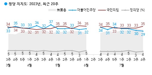국민의힘 35%, 더불어민주당 29%, 정의당 4%, 지지하는 정당 없는 무당층 31%