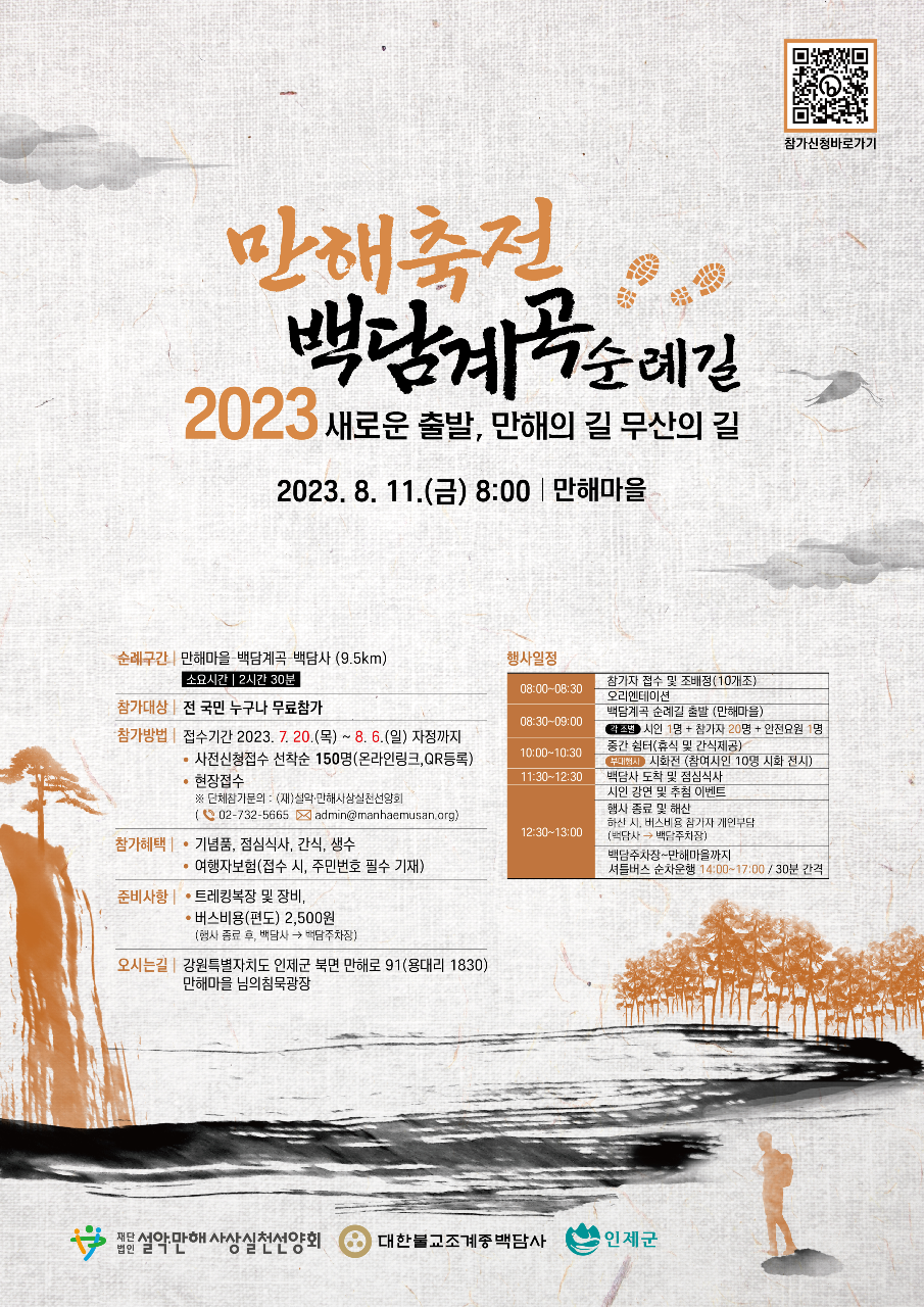 참가비 없이 무료로 진행되는 이번 행사는 별도 자격제한 없이 누구나 신청할 수 있으며 참여인원은 150명으로 제한된다. 예약신청은 오는 8월 9일(수요일)까지 인제군청 홈페이지와 (재)설악·만해사상실천선양회에서 접수한다.