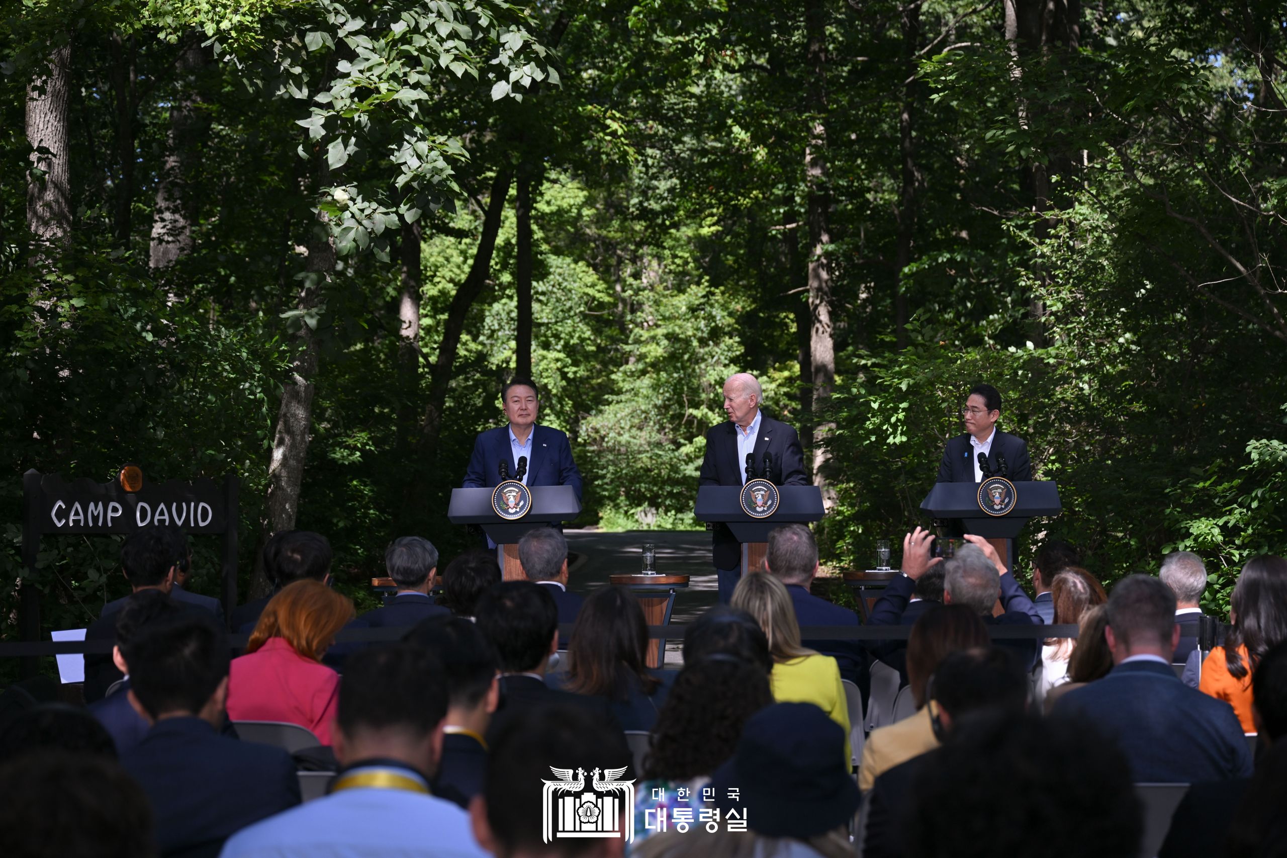 우리는 미래를 위한 공동의 의지와 낙관을 갖고 캠프 데이비드를 떠난다. 우리 앞에 놓여진 기회는 주어진 것이 아니라, 우리가 그 기회를 붙잡은 것이다. 한미일 국민과 인도-태평양 지역 국민들에게 평화롭고 번영하는 미래를 가져다주기 위해서는 우리가 보다 자주 연대해야 한다는 것은 우리 각자가 치열하게 지켜온 의지의 산물이다. 오늘, 우리는 한미일 관계의 새로운 장이 시작되었음을 선언한다. 우리는 비전을 공유하고, 우리 시대의 가장 어려운 도전 앞에 흔들림 없으며, 무엇보다도 한미일이 지금 그리고 앞으로 그러한 도전들에 함께 대처해 나갈 수 있다는 믿음을 함께 한다.