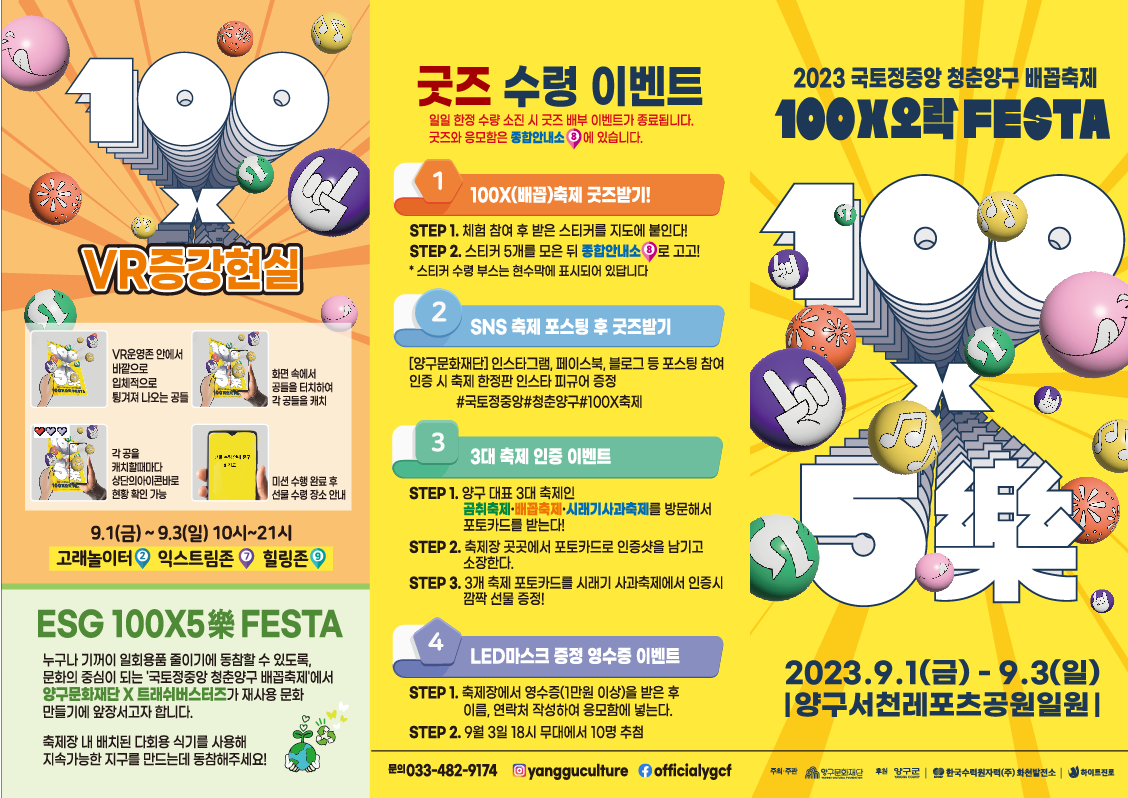 아울러, 미션을 수행하면서 배꼽축제 스티커를 모아 기념품을 수령하는 이벤트인 ‘국토정중앙 양구 100×(배꼽)을 찾아라’도 진행한다. 이벤트는 무중력 체험을 하는 우주갈구양, 축구할구양, 농구할구양, 등반할구양, 서핑할구양, 레이저 서바이벌 게임 등으로 구성됐다.