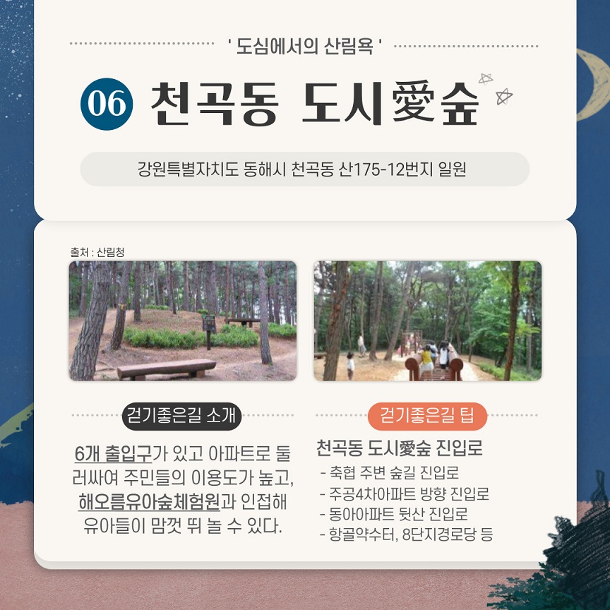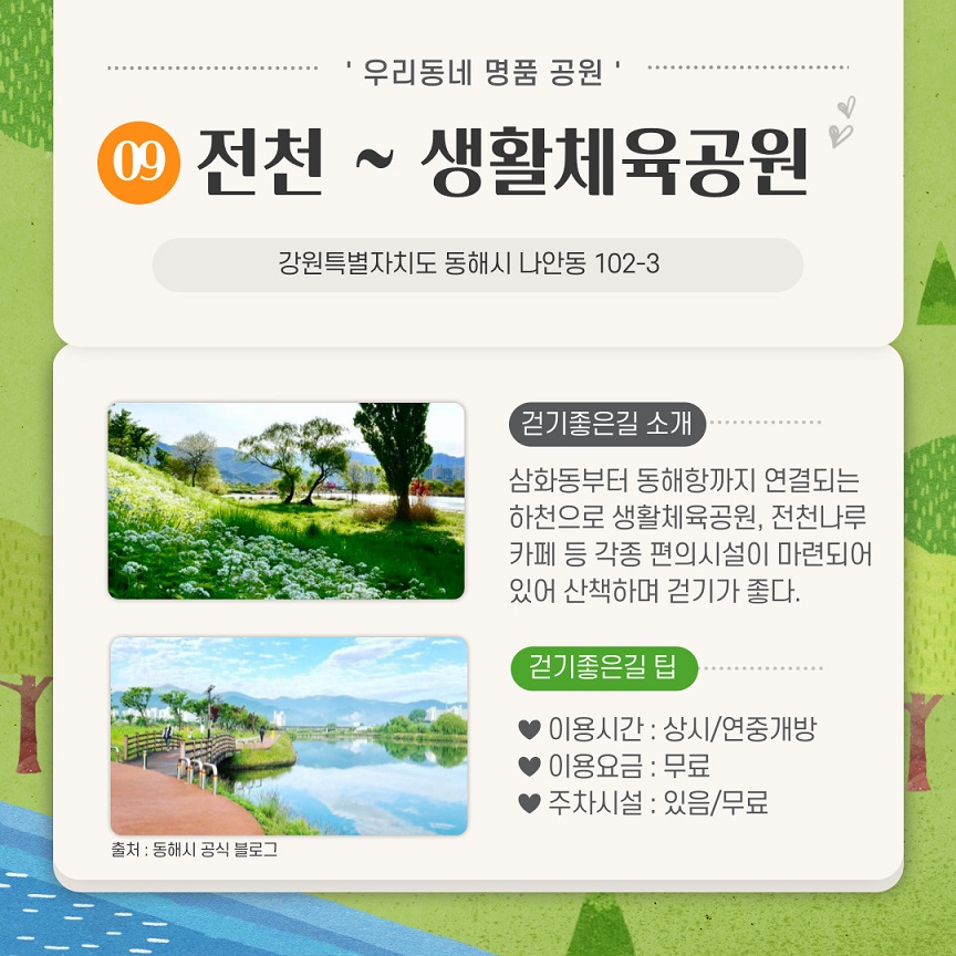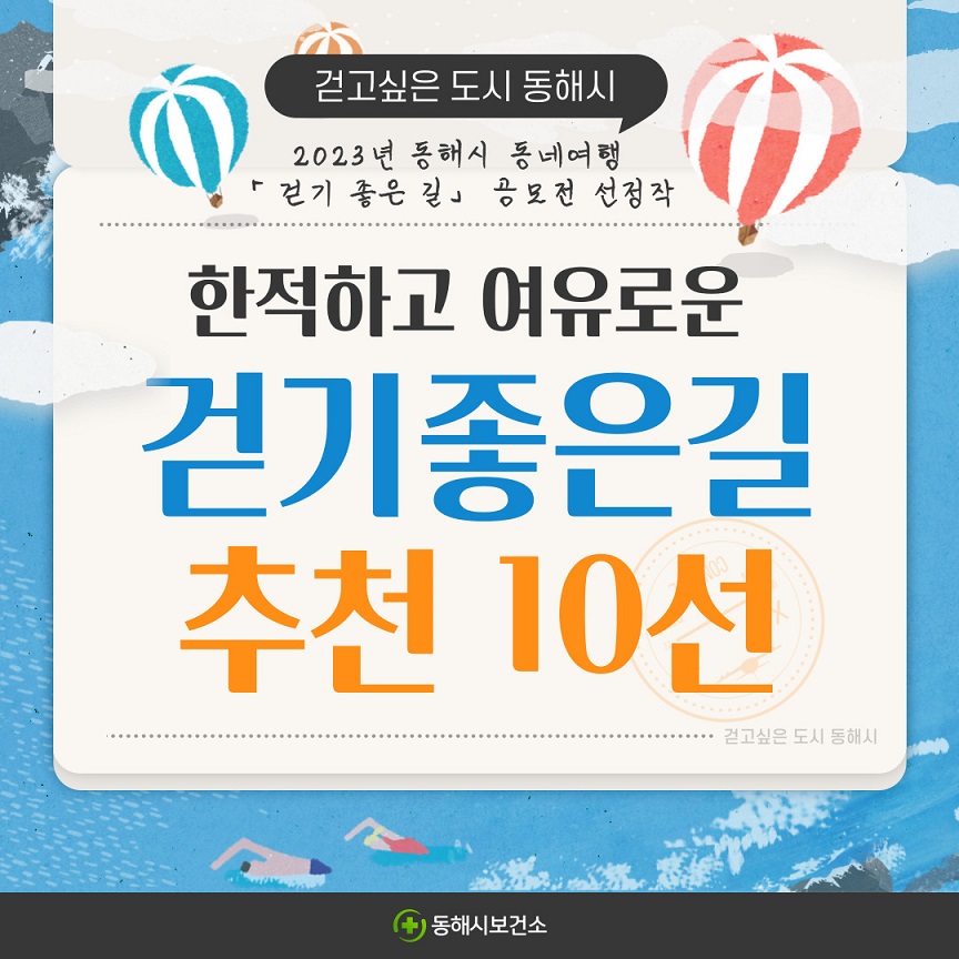 동해시는 한 달간 진행한 동네여행 「걷기 좋은 길」 수기 공모전에서 10곳의 걷기 좋은 길을 선정하였다고 밝혔다. 이번 공모전은 동해시 관광‧문화 자원을 활용한 특색 있는 걷기 좋은 길을 발굴하고, 동해시민의 걷기 실천을 유도하여 건강생활실천 환경을 조성하기 위해 추진하였다.