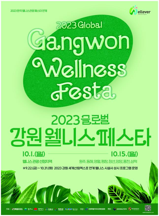 강원특별자치도와 도경제진흥원은 10월 1일부터 10월 15일까지 문화체육관광부에서 선정된 웰니스 시군 및 도내 추천웰니스 관광지에서「2023 글로벌 강원 웰니스 페스타」를 개최한다고 밝혔다.