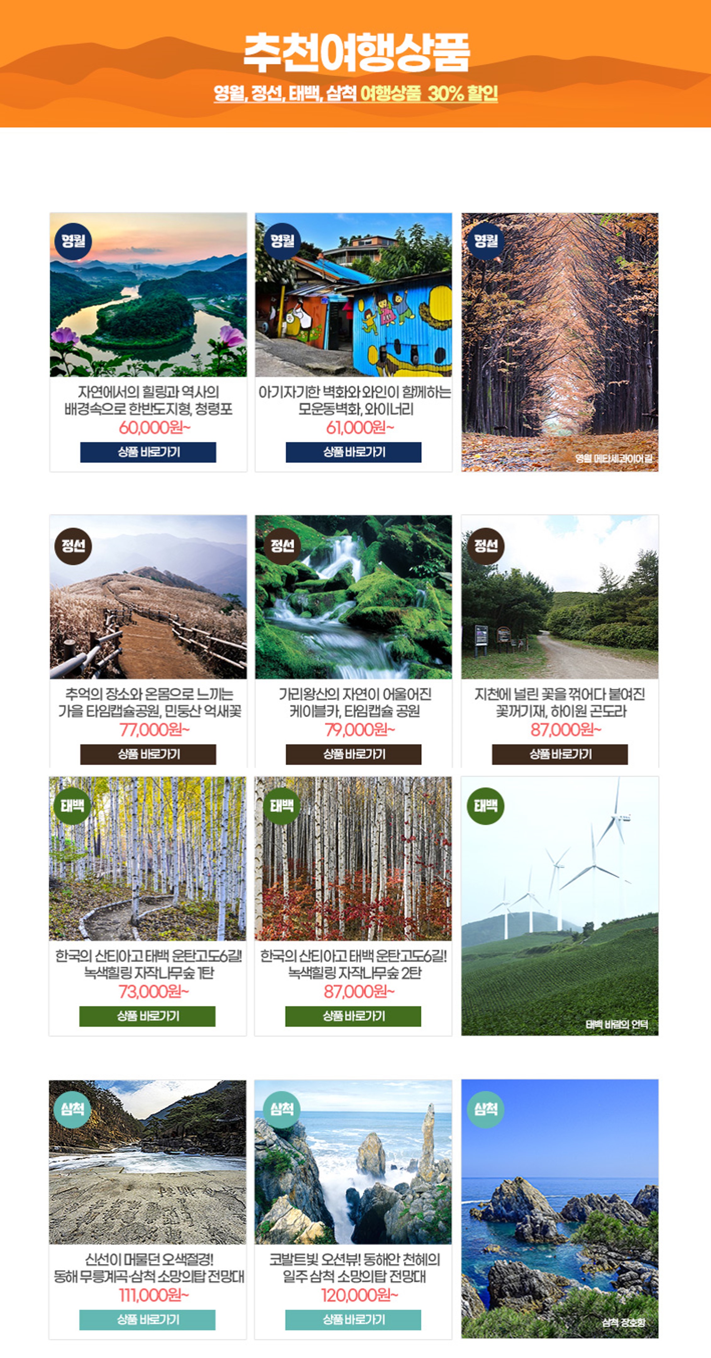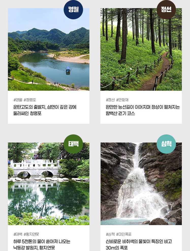 주요 여행지는 운탄고도1330 트레킹 코스와 △태백 지지리골 △삼척 덕봉산 해안생태탐방로 △영월 모운동 벽화마을 △정선 타임캡슐공원 등이다.