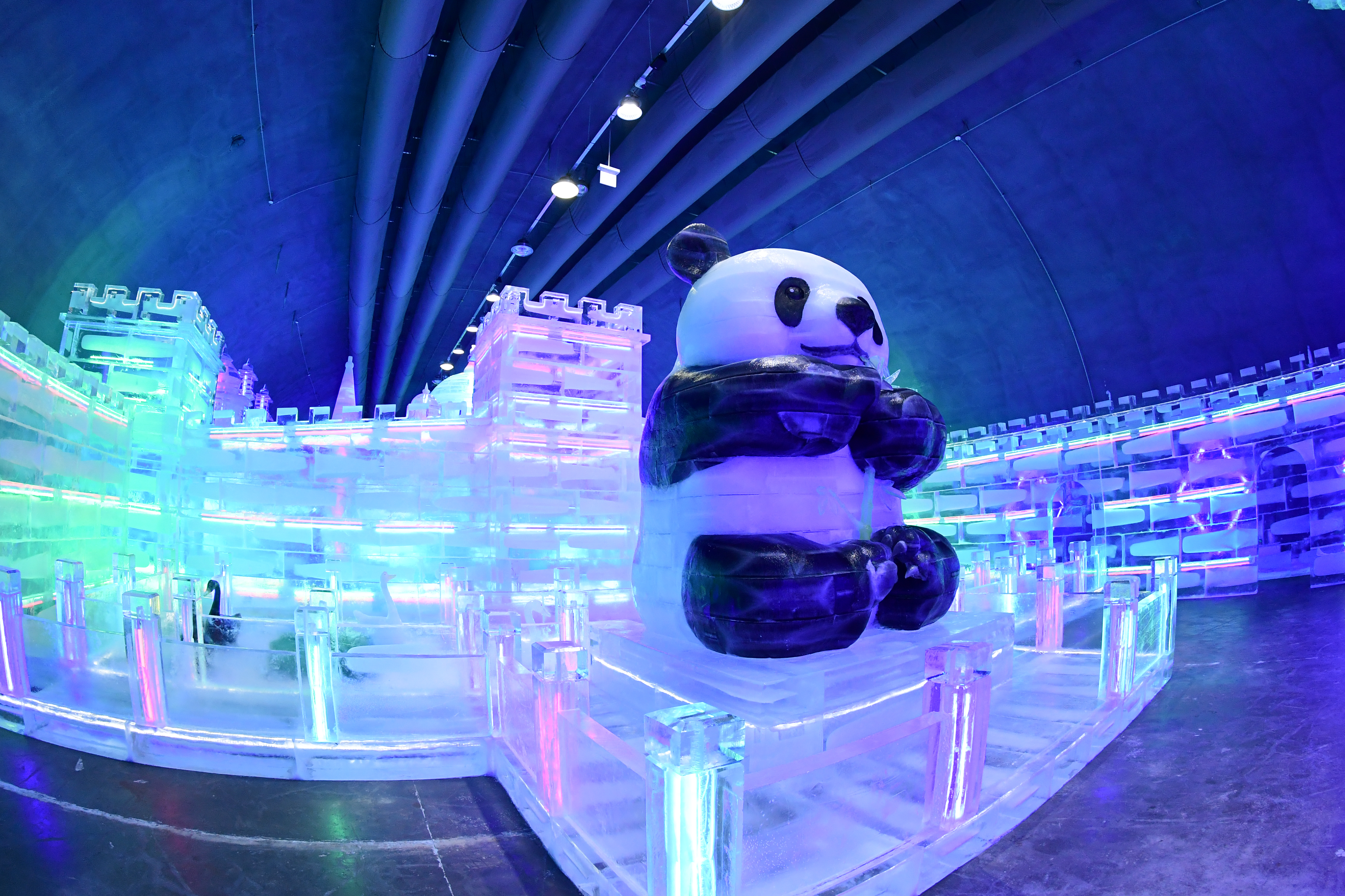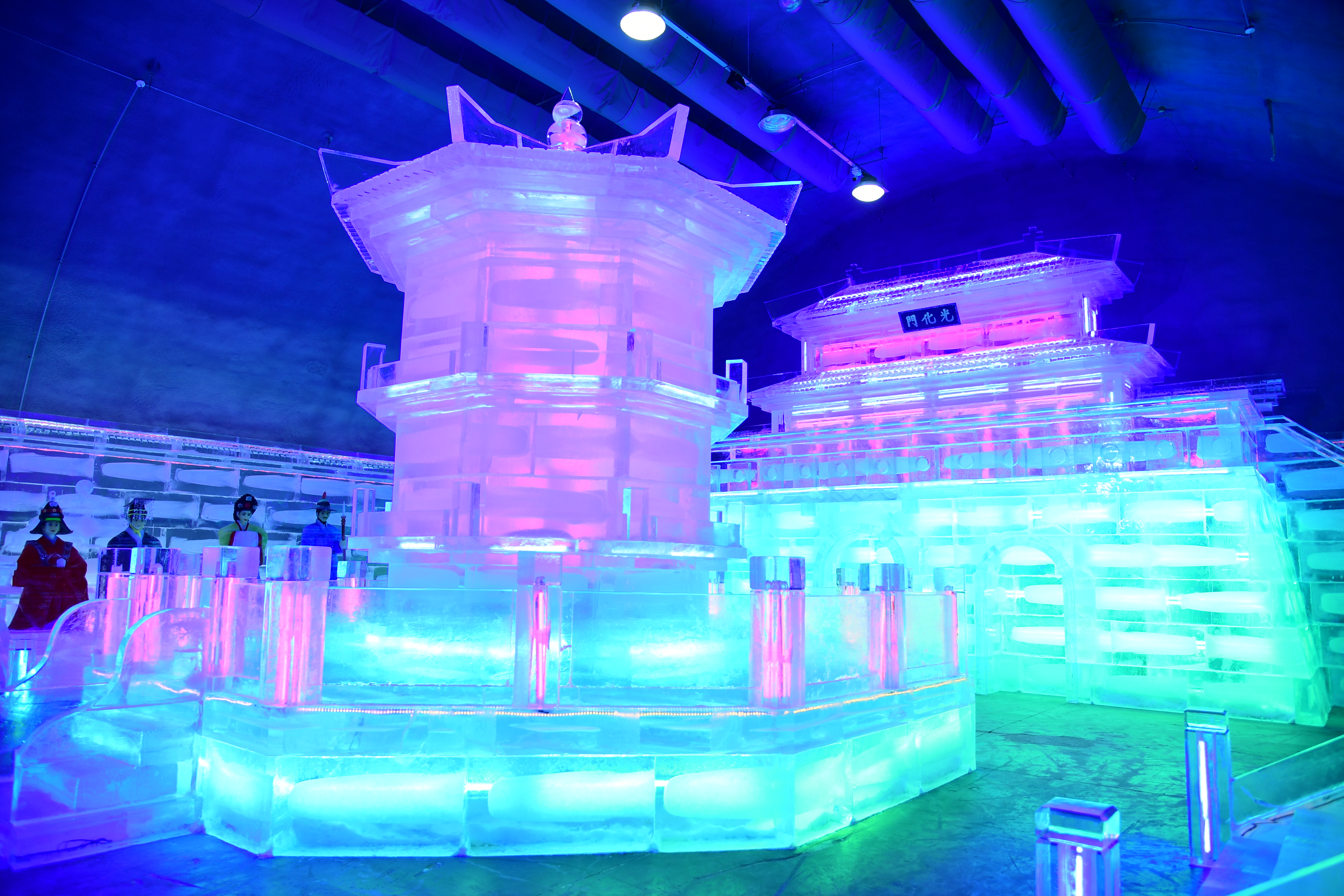 이날 공개된 실내얼음조각광장에는 지난달 입국한 하얼빈 주재 빙설문화발전 유한공사 기술진들이 조각한 세계 유명 건축물 모형과 각종 조형물이 모습을 드러내 관광객들의 탄성을 이끌어 냈다.