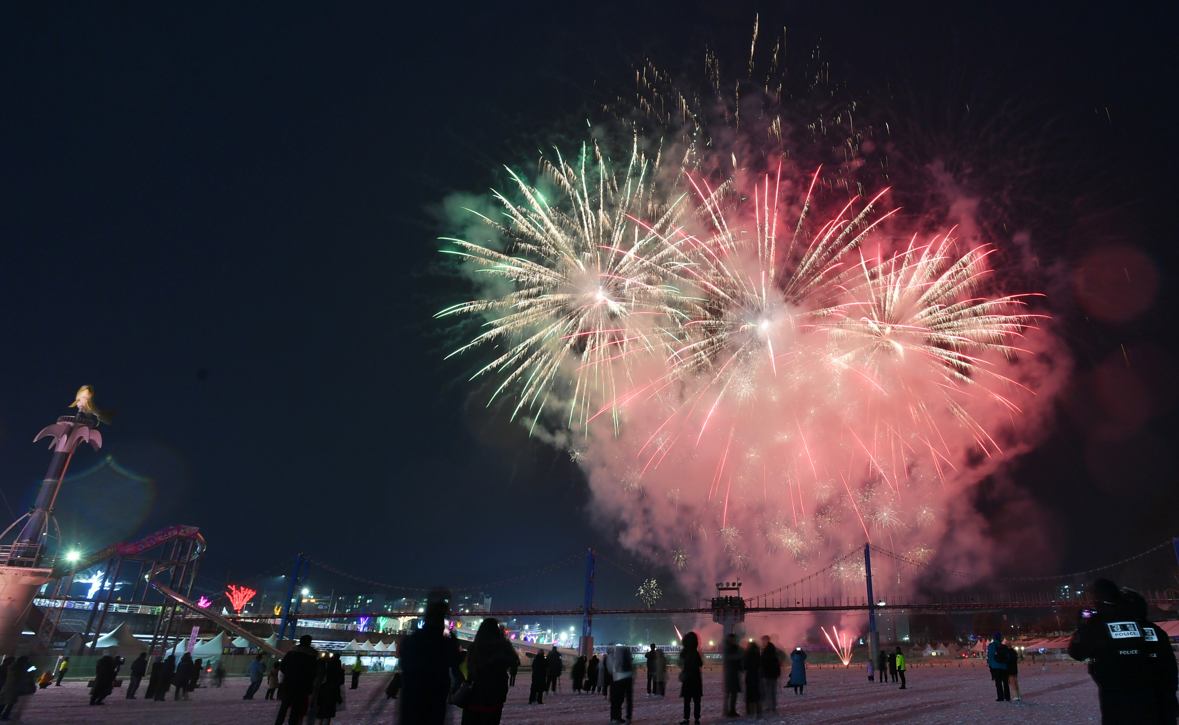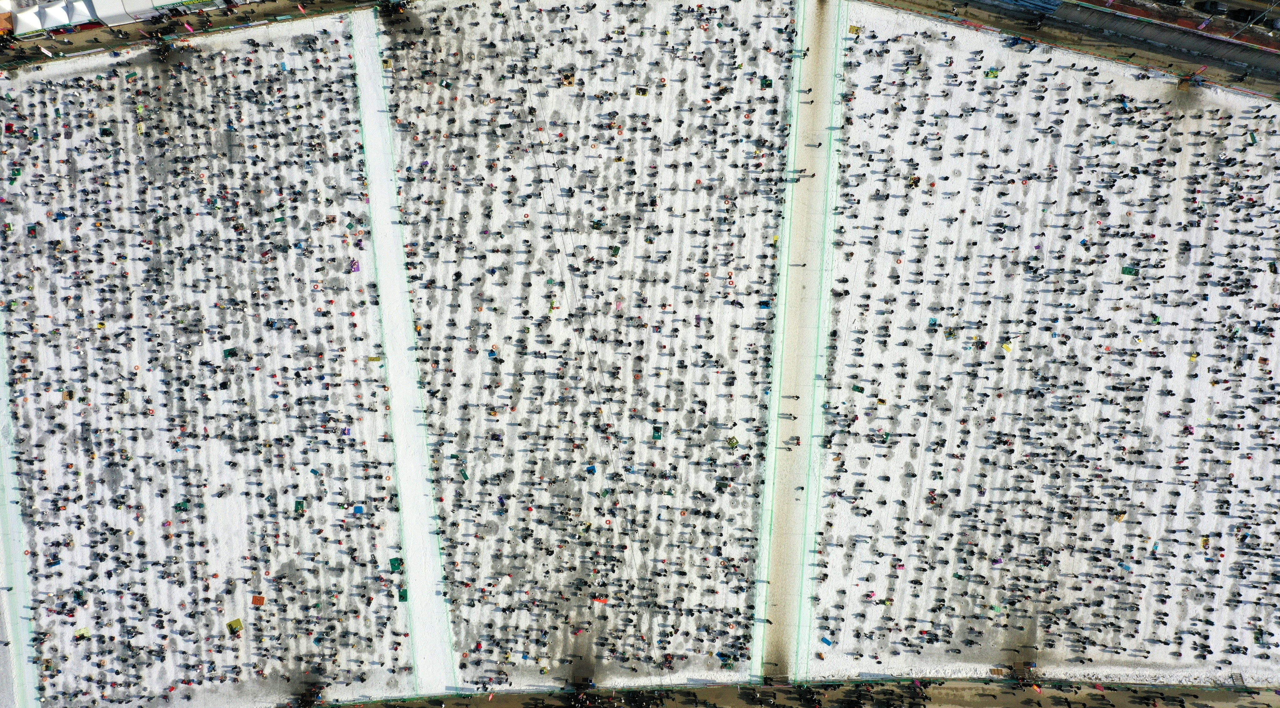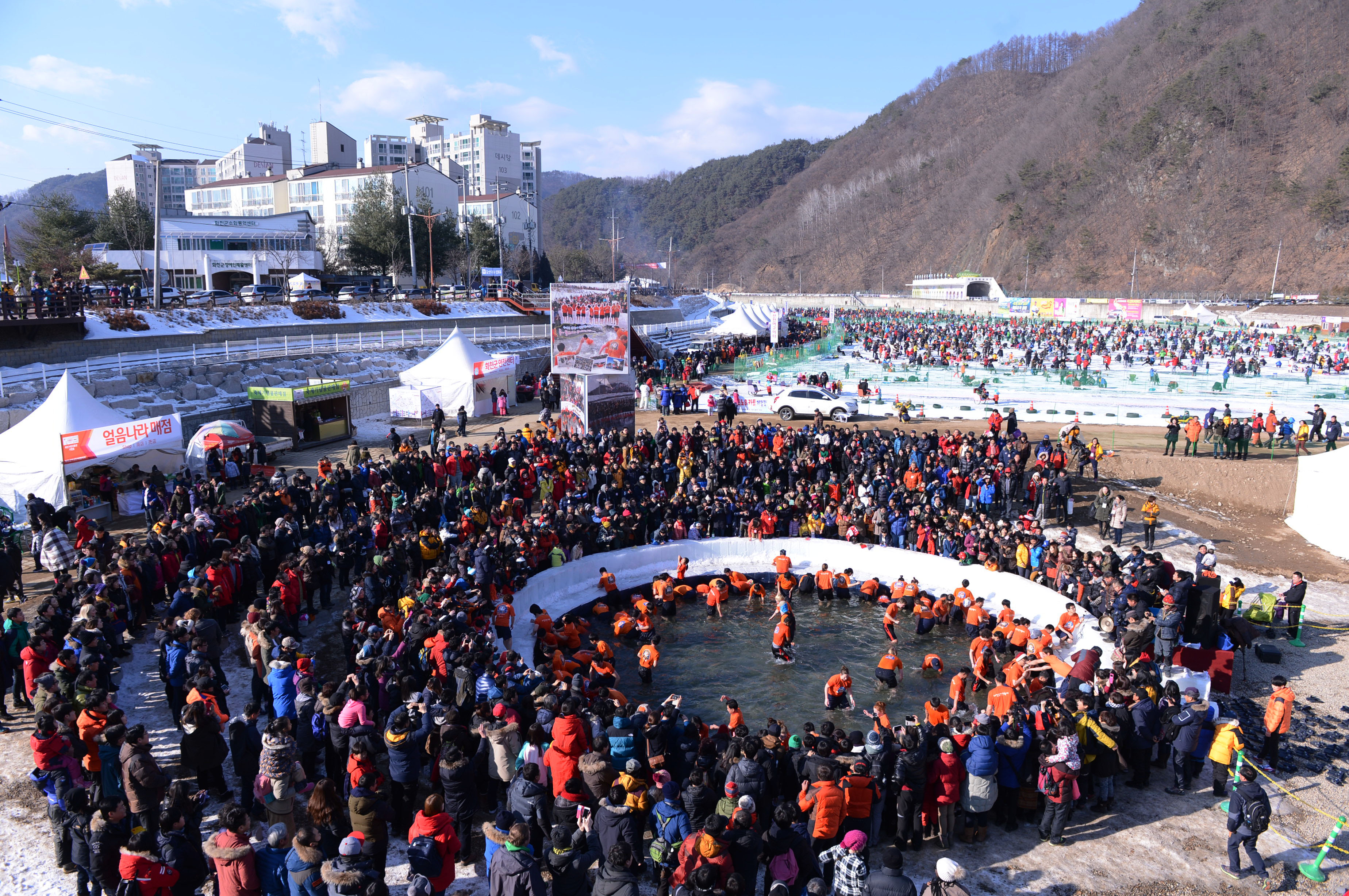 화천산천어축제장에서는 거대한 얼음판 위에 동시에 수만명이 오르내리는 장면이 매일 반복된다.