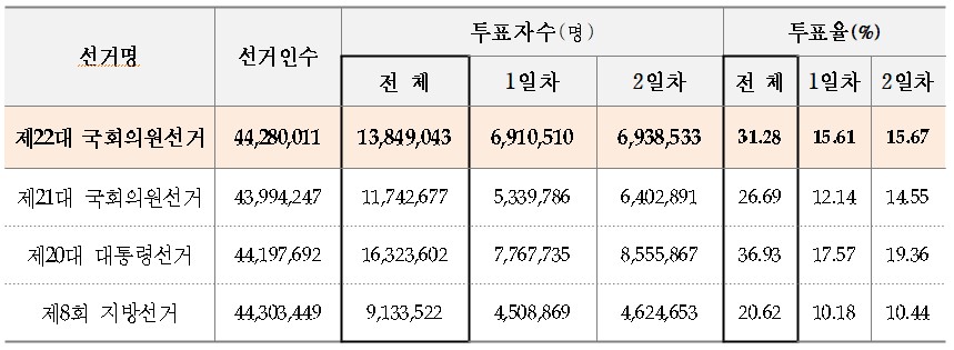 제22대 국회의원 선거 사전투표율이 31.28%를 기록해 역대 국회의원 선거 중 가장 높은 사전투표율을 기록했다. 중앙선거관리위원회는 5~6일 이틀간 사전투표에서 총유권자 4428만 11명 중 1384만9043명이 참여했다고 밝혔다. 21대 총선 사전투표 투표율 26.69%로 그 보다 4.59%포인트 높았다. 20대 대통령선거는 36.93%, 8회 지방선거는 20.62%를 기록했다.