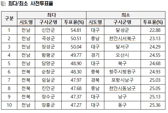 최고 전남 신안군 54.81%, 최저 대구 동구 25.36%