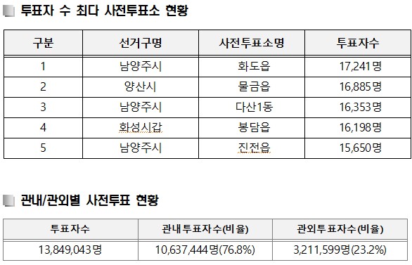 중앙선관위, 제22대 국회의원선거 사전투표 1,384만여 명 참여, 투표율 31.28%...역대 총선 최고 기록 본문