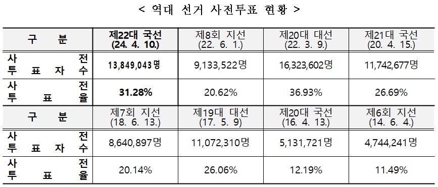 중앙선거관리위원회는 4월 5일부터 6일까지 실시된 제22대 국회의원선거의 사전투표에 전체 선거인 44,280,011명 중 13,849,043명이 참여해 역대 국회의원선거 중 최고인 31.28%의 투표율을 기록하였다고 밝혔다.