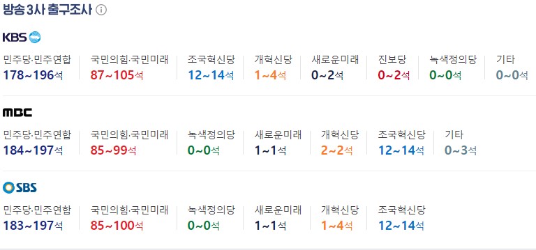 민주당과 더불어민주연합이 184~197석 국민의힘과 국민의미래 85~99석