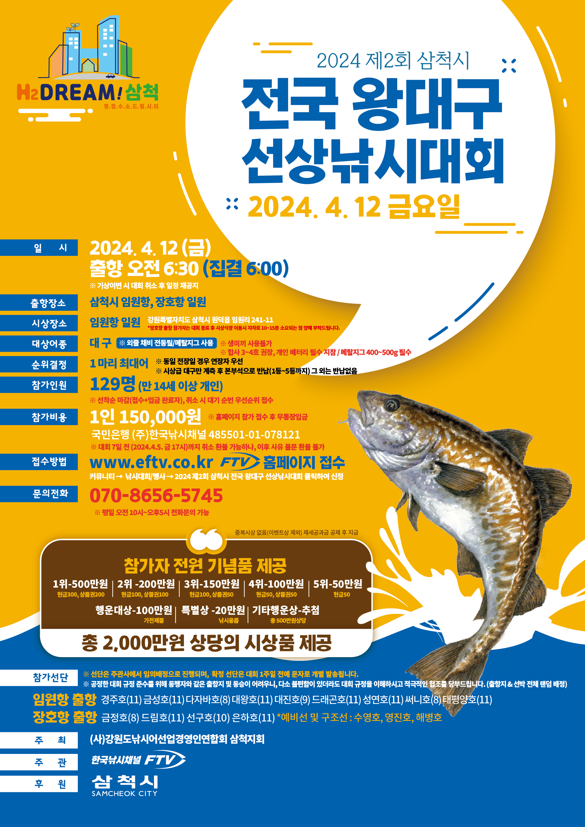 강원특별자치도낚시어선경영인연합회삼척지회가 주최하고, ㈜한국낚시채널(FTV)가 주관하며, 삼척시가 후원하는 이번 대회는 전국 낚시인 129명이 참가할 예정이다.
