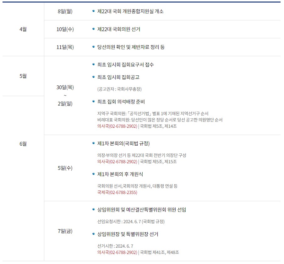 먼저 5월 말 원 구성을 위한 첫 임시회를 개최한다. 그리고 6월 초 제1차 본회의를 통해 국회의장단이 선출되며 개원식을 하게된다. 이후 교섭단체(국회의원 20인 이상) 간의 협의 과정을 거쳐 상임위 및 특위를 구성한다. 각 위원장은 선거로 선출한다. 이 과정을 마쳐야 제22대 국회가 본격적으로 시작되었다고 볼 수 있다.