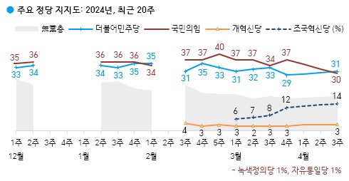 현재 지지하는 정당은 국민의힘 30%, 더불어민주당 31%, 조국혁신당 14%, 개혁신당 3%, 녹색정의당·자유통일당 각각 1%, 지지하는 정당 없는 무당층 18%다. 총선 전인 지난달 대비 국민의힘은 급락해 현 정부 출범 후 최저치가 됐고, 조국혁신당은 창당 이후 상승세를 유지했으며 이외 정당은 거의 변함없었다.