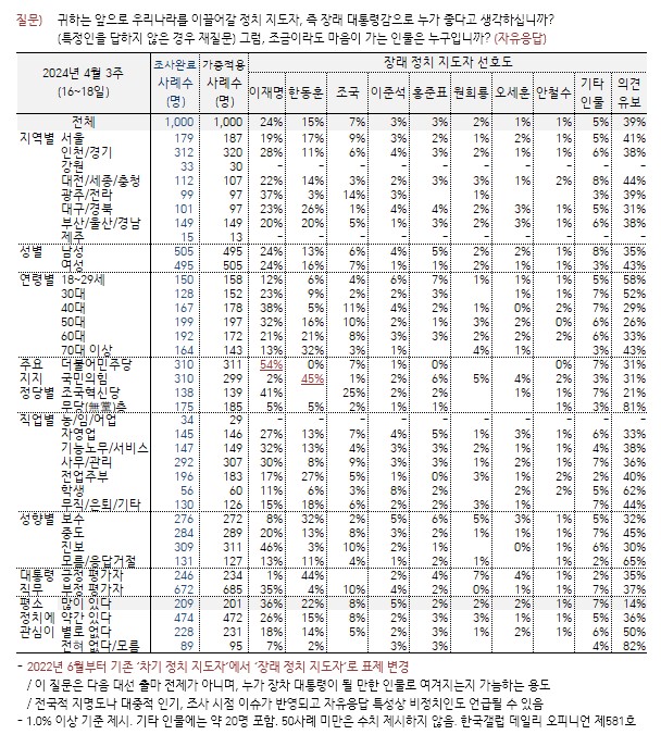 한국갤럽이 2024년 4월 16~18일 전국 유권자 1,000명에게 앞으로 우리나라를 이끌어갈 정치 지도자, 즉 장래 대통령감으로 누가 좋다고 생각하는지 물었다.