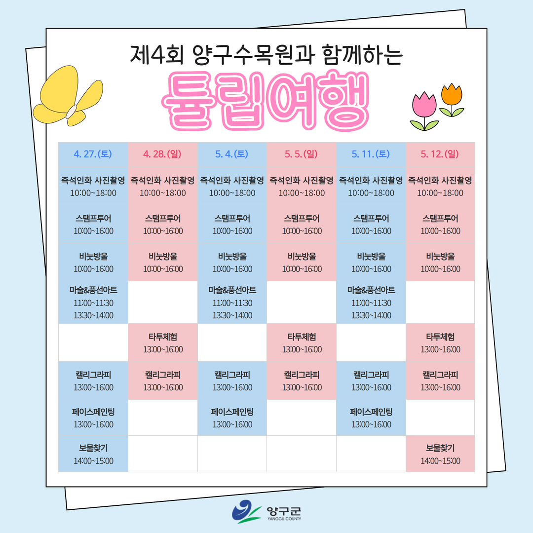 양구군이 27일부터 5월 12일까지 양구수목원에서 ‘제4회 수목원과 함께하는 튤립 여행’ 행사를 개최한다.