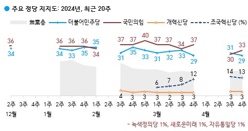 정당 지지도: 국민의힘 30%, 더불어민주당 31%, 조국혁신당 14%, 무당층 18% 대통령 직무 수행 평가: '잘하고 있다' 23%, '잘못하고 있다' 68% 한국갤럽이 2024년 4월 셋째 주(16~18일) 전국 만 18세 이상 유