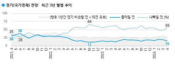 향후 1년간 우리나라 경제 나빠질 것 55%, 좋아질 것 15%, 비슷할 것 27%