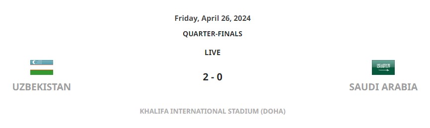 2024 AFC U-23 카타르 아시안컵 8강전 우즈베키스탄 과 사우디아라비아 경기는 전반 45분 우즈베키스탄 쿠사인 노르차예프 선수가 선취골을 넣으며 1:0으로 앞서 나갔다.