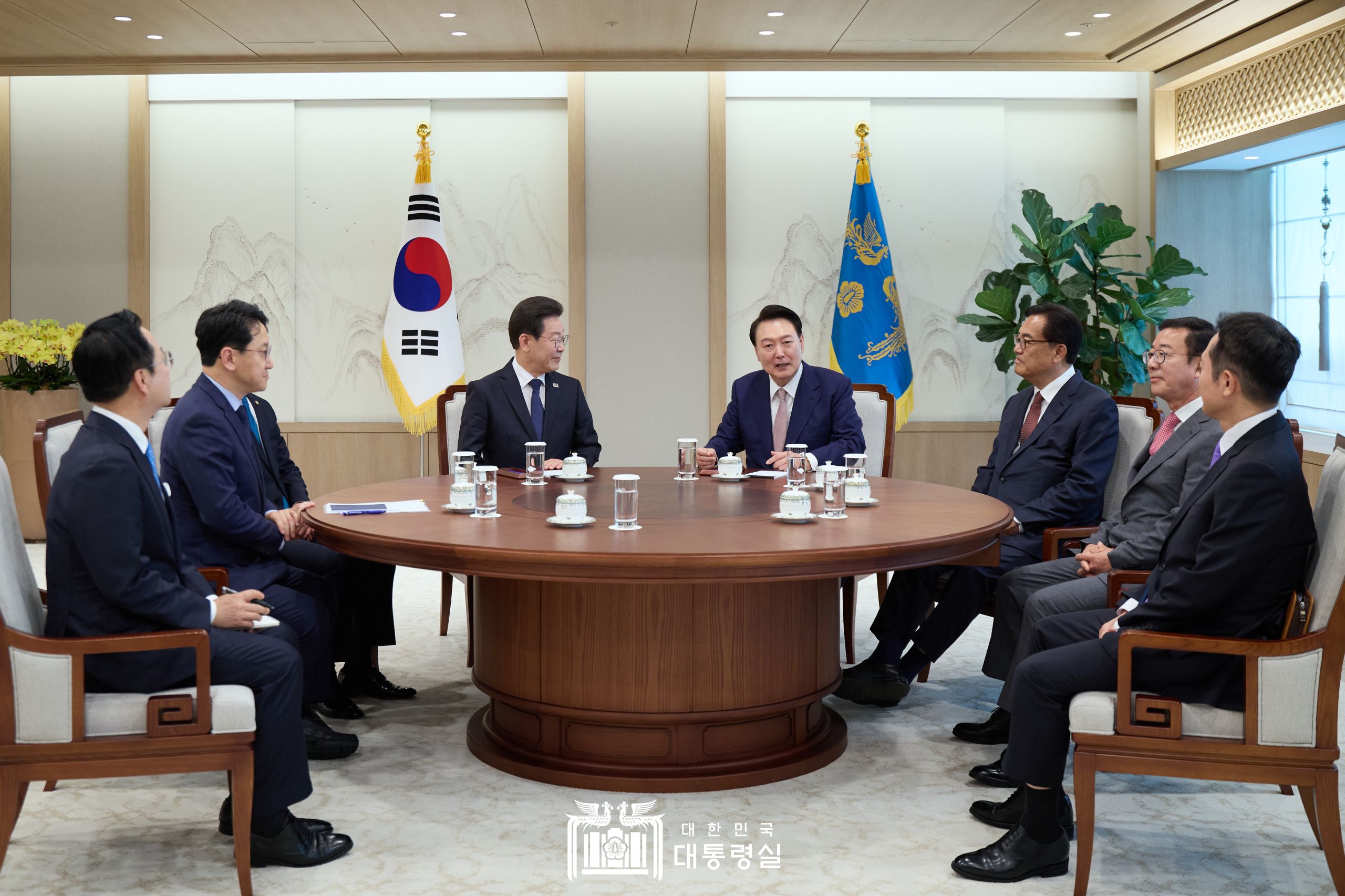 오늘(29일) 오후 2시 대통령실 2층 집무실에서 윤석열 대통령-이재명 대표가 회담을 가졌다. 참석자는 대통령실 정진석 비서실장, 홍철호 정무수석, 이도운 홍보수석과 더불어민주당 진성준 정책위의장, 천준호 당대표 비서실장, 박성준 수석대변인이 참석했다.