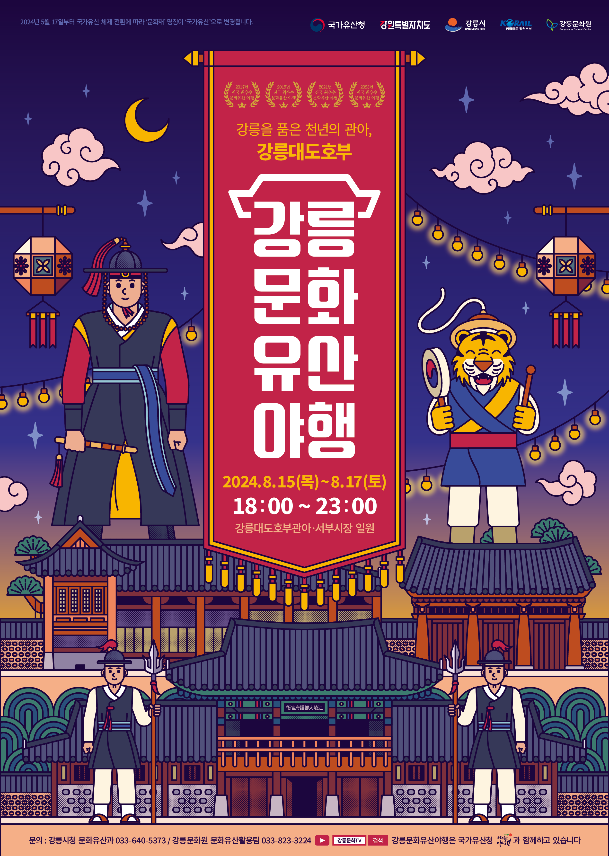 기존 ‘강릉문화재야행’으로 익숙한 본사업은 1962년 문화재보호법 제정 이래 유지해온 문화재 명칭과 분류 체계에서 2024년 5월 17일 유네스코 등 국제기준에 부합하는 문화·자연·무형의 국가유산 체제 전환되었으며 ‘강릉문화유산야행’으로 사업명을 변경하고 새롭게 선보인다.