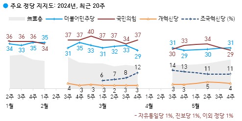 정당 지지도: 국민의힘 29%, 더불어민주당 31%, 조국혁신당 11%, 무당층 22%