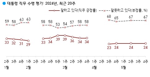 한국갤럽이 2024년 5월 넷째 주(21~23일) 전국 만 18세 이상 유권자 1,001명에게 윤석열 대통령이 현재 대통령으로서의 직무를 잘 수행하고 있다고 보는지 잘못 수행하고 있다고 보는지 물었다.