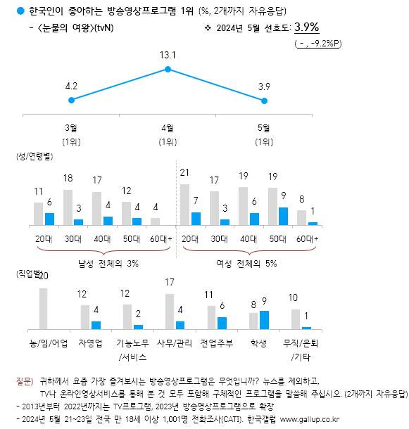한국갤럽, 한국인이 좋아하는 방송영상프로그램 1위 : tvN 주말극 눈물의 여왕 3.9% 본문