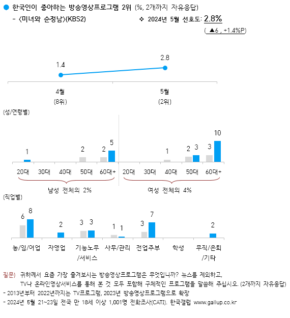 한국갤럽은 2024년 5월 21~23일 전국 만 18세 이상 1,001명에게 요즘 가장 즐겨보는 방송영상프로그램을 물었다.