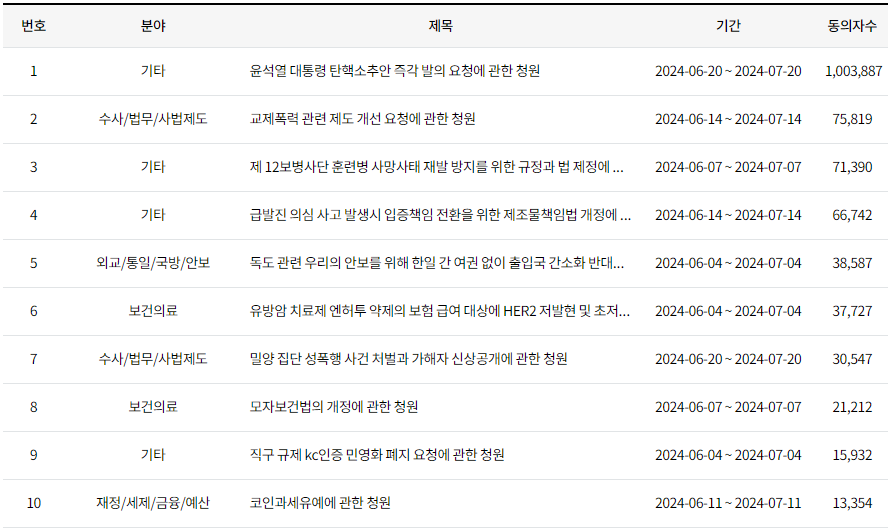 | 윤석열 대통령 탄핵소추안 즉각 발의 요청에 관한 청원 70만 돌파 (0) | 2024.06.30 |