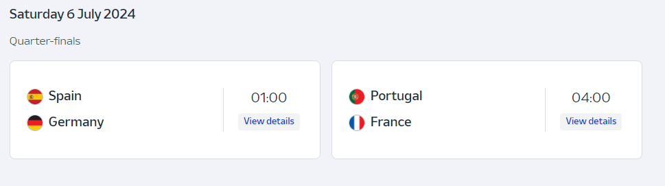 7월 6일 새벽 UEFA 유로 2024 8강전 첫 경기가 01:00 스페인과 독일, 04:00 포르투갈과 프랑스 경기가 열린다. 사실상 미리보는 결승전이라고 해도 과언이 아니다.