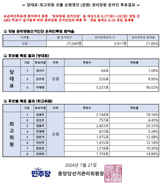 | 더불어민주당 당대표 최고위원 선출 순회경선 인천 권리당원 온라인 투표결과 (0) | 2024.07.20 |
