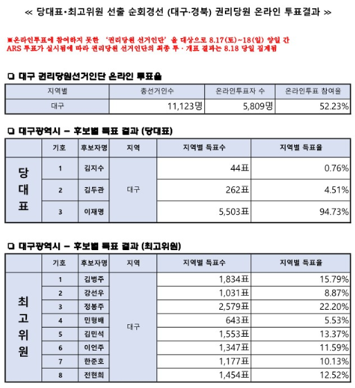 당대표 선거는 먼저 대구는 이재명 94.73%, 4.51%, 김지수 0.76%였고, 경북은 이재명 93.97%, 김두관 5.2%, 김지수 0.83%를 득표했다.