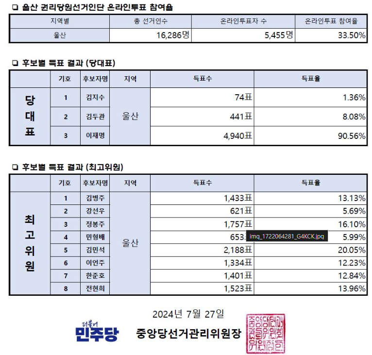 2024.07.20 - [정치평론/정치] - 더불어민주당 당대표 최고위원 선출 순회경선 인천 권리당원 온라인 투표결과