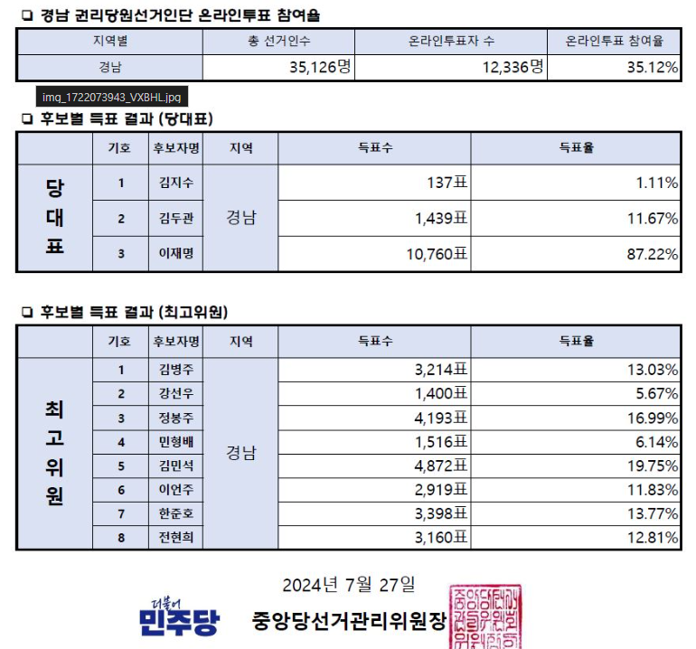 2024.07.27 - [정치평론/정치] - 더불어민주당 당대표 및 최고위원선거 권리당원 온라인투표 결과(울산)