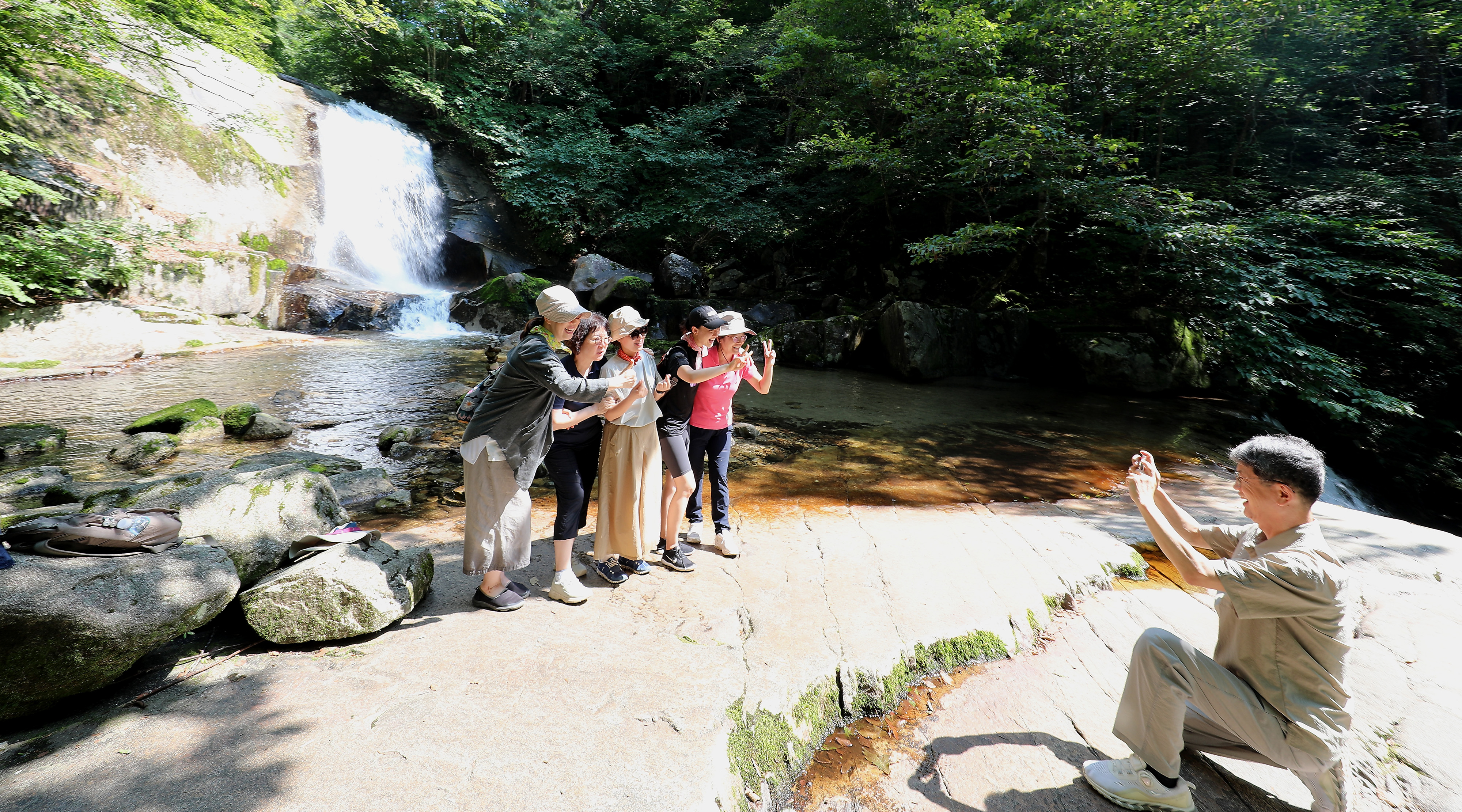 인제 기린면에 위치한 방태산 이단폭포에서 떨어지는 시원한 물줄기와 방태산의 울창한 수림이 멋진 풍경을 연출하며 관광객들에게 시원한 여름을 선사하고 있다. 한정복 기자 gn3369@naver.com