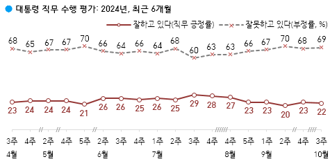 대통령 직무 수행 평가: '잘하고 있다' 22%, '잘못하고 있다' 69%