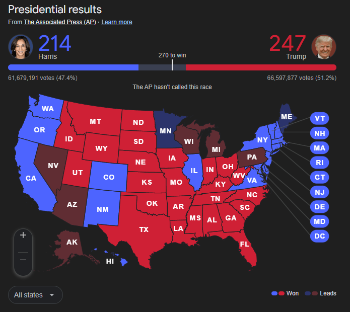 나머지 5곳 경합주도 모두 우세…해리스 행사장 지지자들 떠나기 시작해 미국 대선 공화당 후보인 도널드 트럼프 전 대통령이 경합주인 노스캐롤라이나주에 이어 조지아주에서도 승리를 확정