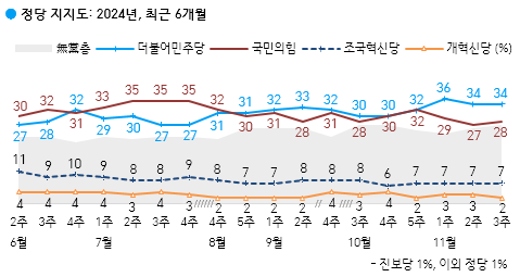 정당 지지도: 국민의힘 28%, 더불어민주당 34%, 조국혁신당 7%, 무당층 27%