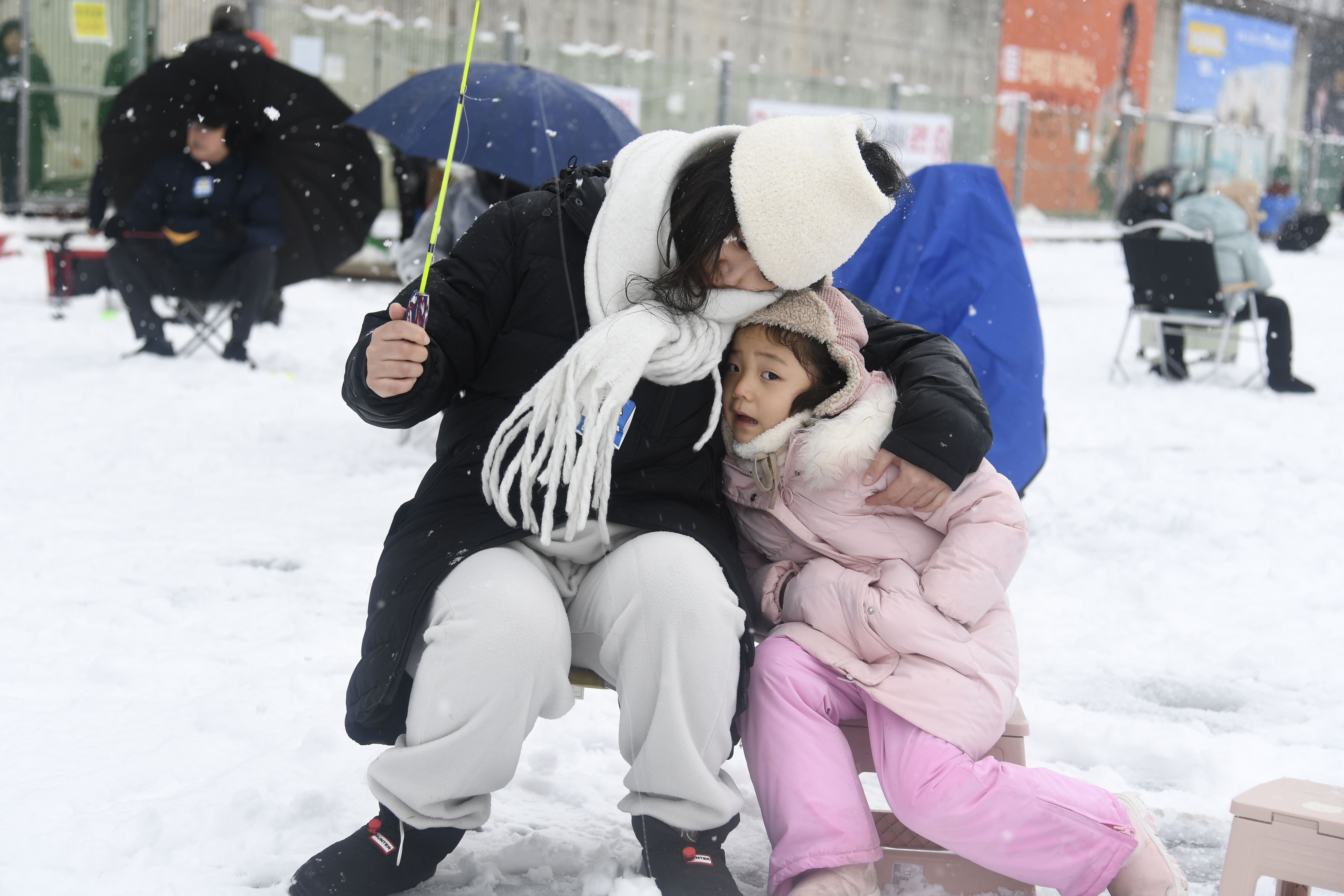 27일, 함박눈이 내리고 있는 2025 화천산천어축제장에서 관광객들이 눈을 맞으며 산천어 얼음낚시 삼매경에 빠져있다. 화천군과 (재)나라 측은 이날 새벽부터 제설작업에 나서 주요 통로와 출입구에 쌓인 눈을 빠르게 제거해 관광객들의 안전한 이동을 지원했다.