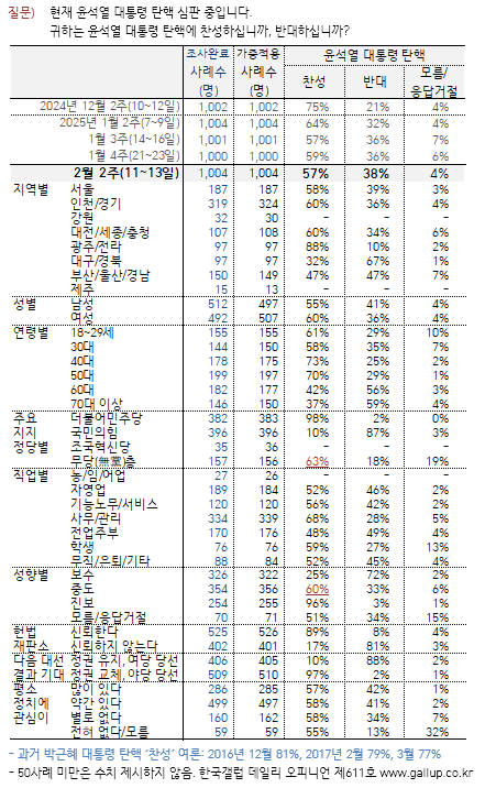 [한국갤럽] 윤석열 대통령 탄핵 찬성 57%, 반대 38% 본문