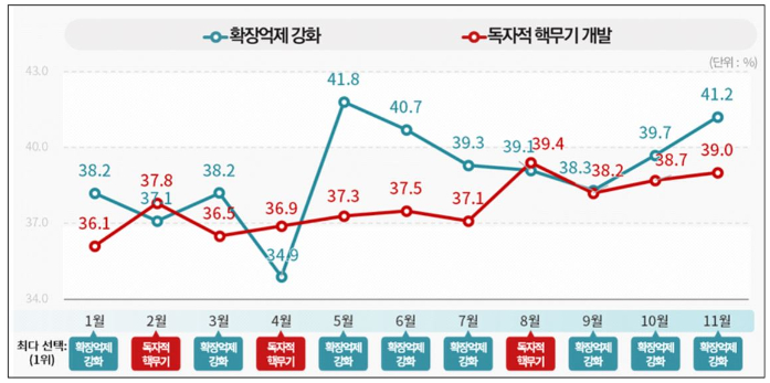 각종 여론조사에서도 찬성 이유로 “북핵 위협에 맞대응”이 가장 많이 언급되고 있다. 미국의 확장억제와 핵우산에 대한 의구심도 커지면서, 스스로를 방어할 수 있는 능력을 갖추어야 한다는 주장이다. 다시 말해 남북한 간 핵 균형이 국익에 도움이 될 수 있으며, 국제정세 변화 속에서도 독립적인 군사력을 확보해야 한다는 것이다. 최근 여론조사에서도 자체 핵무장 여론은 높아지고 있어 향후 정책적 결정에 중요한 영향을 줄 것으로 보인다.