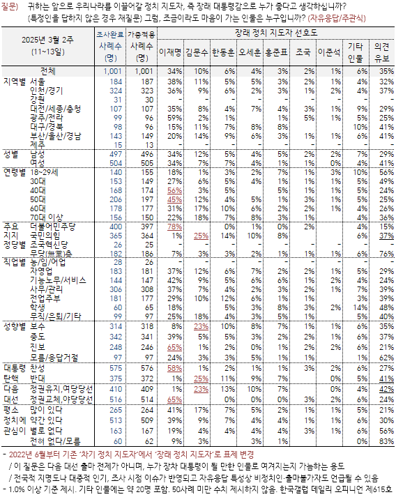 한국갤럽이 2025년 3월 11~13일 전국 유권자 1,001명에게 앞으로 우리나라를 이끌어갈 정치 지도자, 즉 장래 대통령감으로 누가 좋다고 생각하는지 물었다.