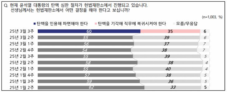 그 결과, ‘탄핵을 인용해 파면해야 한다’는 비율이 60%, ‘탄핵을 기각해 직무에 복귀시켜야 한다’는 35%로 응답했다.